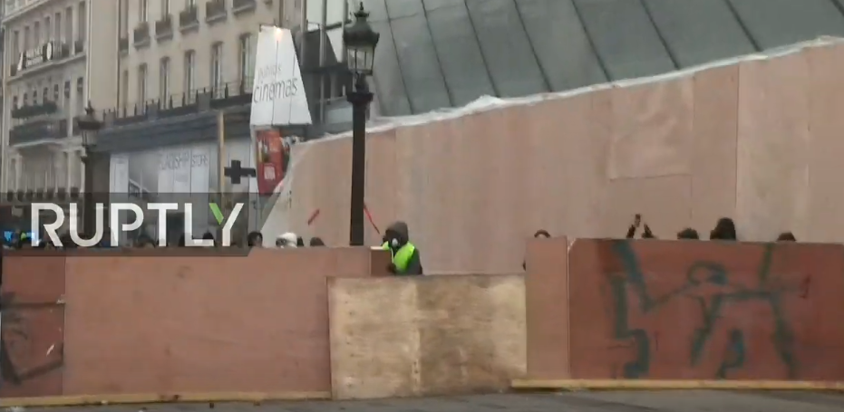 10:44  Протестующих оттеснили от Триумфальной арки. Полиция под свист и крики заняла новые позиции. "Жилеты" затянули Марсельезу - гимн Франции.
