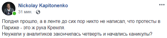 "Полдня прошло, а в ленте до сих пор никто не написал, что протесты в Париже - это ж рука Кремля. Неужели у аналитиков закончилась четверть и начались каникулы?", - иронизирует политолог Николай Капитоненко.