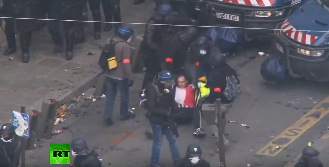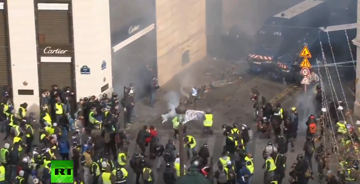 13:05  Полиция в ста метрах от Триумфальной арки снова забросала протестующих газом. Силовики что-то монотонно кричат в громкоговоритель.