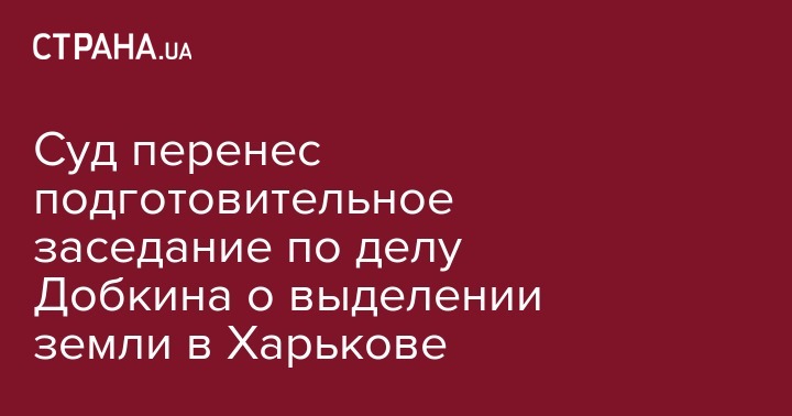 Дзержинский районный суд Харькова перенес назначенное на четверг подготовительное заседание по делу о выделении земли в городе по т.н. кооперативной схеме в 2008-10гг., в котором подозревают народного депутата, бывшего городского голову Харькова Михаила Добкина и еще нескольких чиновников, работавших в то время в горсовете. Об этом сообщает "Интерфакс-Украина".