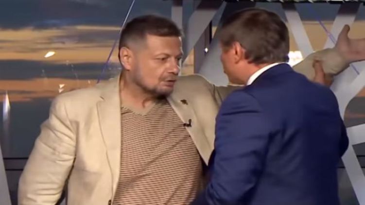 Тогда Шахов толкнул Мосийчука со словами "животное", и тот упал. Поднявшись, Мосийчук попытался нанести обидчику ответный удар тростью, но оппонентов разняла ведущая.