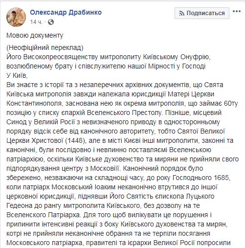 Вселенский патриарх Варфоломей направил письмо предстоятелю УПЦ МП Онуфрию с призывом "немедленно прибыть" на Объединительный собор и принять участие в нем. Письмо, датированное, что любопытно, еще 12 октября, обнародовал на своей странице в Facebook митрополит УПЦ МП Александр Драбинко (единственный безоговорочный сторонник автокефалии среди иерархов УПЦ).