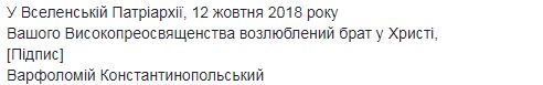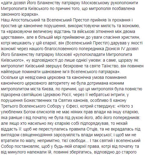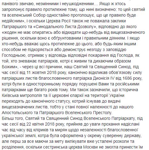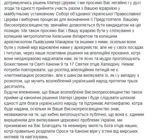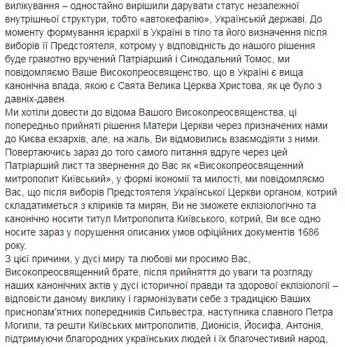 "До момента формирования иерархии в Украине в тело и его определение после выборов ее предстоятеля, которому в соответствии с нашим решением будет грамотно вручен Патриарший и Синодальный Томос, мы извещаем Ваше Высокопреосвященство, что в Украине есть высшая каноническая власть, которой является Святая Великая Церковь Христова, как это было с давних времен. Мы хотели довести до сведения Вашего Высокопреосвященства, эти предварительно принятые решения Матери Церкви через назначенных нами в Киев экзархов, но, к сожалению, Вы отказались взаимодействовать с ними. Возвращаясь сейчас к тому же вопросу второй раз за это Патриаршее письмо и обращение к Вам как "Высокопреосвященному митрополиту Киевскому", в форме икономии и милости, мы сообщаем Вам, что после выборов Предстоятеля Украинской Церкви органом, который будет состоять из клириков и мирян, Вы не сможете эклизиологично и канонически носить титул Митрополита Киевского, который, Вы все равно носите сейчас в нарушение описанных условий официальных документов 1686 года", – говорится в письме.