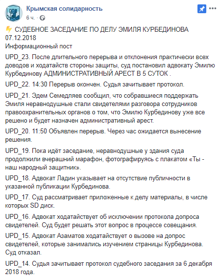 7 декабря Киевский районный суд Симферополя в оккупированном Крыму арестовал задержанного днем ранее адвоката Эмиля Курбединова, который защищал крымскотатарских активистов и военнопленных моряков, на 5 суток. Об этом сообщает организация "Крымская солидарность" на своей странице в Facebook.