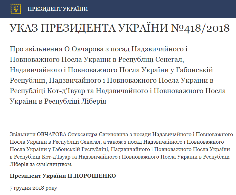 7 декабря был опубликован указ президента Украины Петра Порошенко об увольнении Александра Овчарова с должности посла Украины в Республике Сенегал, Габонской Республике, Республике Кот-д'Ивуар и Республике Либерия. Указ №418/2018 опубликован на сайте главы государства.