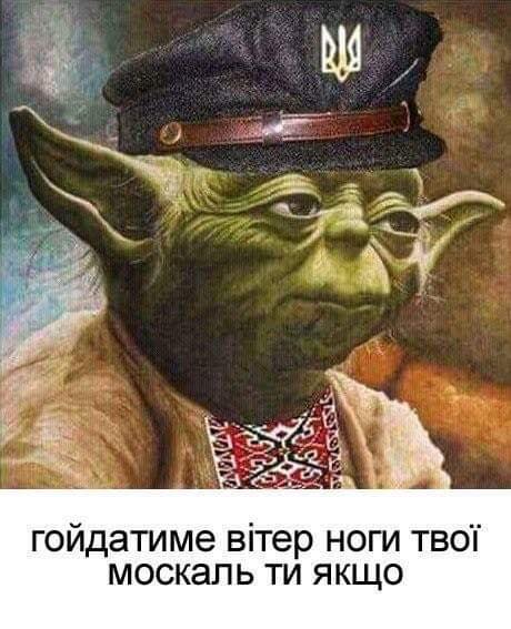 На фото Магистр Йода из кинематографической саги Звездные войны изображен в вышиванке и картузе с трезубом. Фото сопровождается подписью "Гойдатиме вітер ногі твої москаль якщо ти".