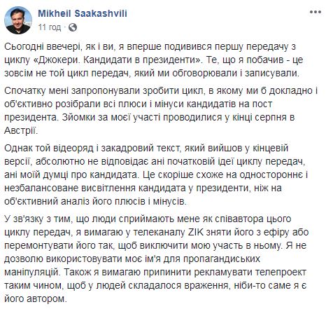 В эфире телеканала ZIK вышел первый выпуск передачи "Джокеры. Кандидаты в президенты", которую на украинском языке вел экс-президент Грузии и бывший губернатор Одесской области Михаил Саакашвили. Выпуск мгновенно получился скандальным, поскольку Саакашвили заявил, что его имя использовали для пропаганды.
