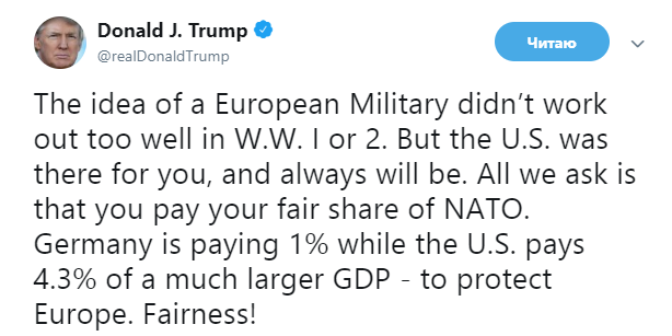 Президент добавил, что США всегда будут поддерживать Европу, но для этого необходимо, чтобы европейские страны делали "справедливые взносы" в бюджет НАТО.