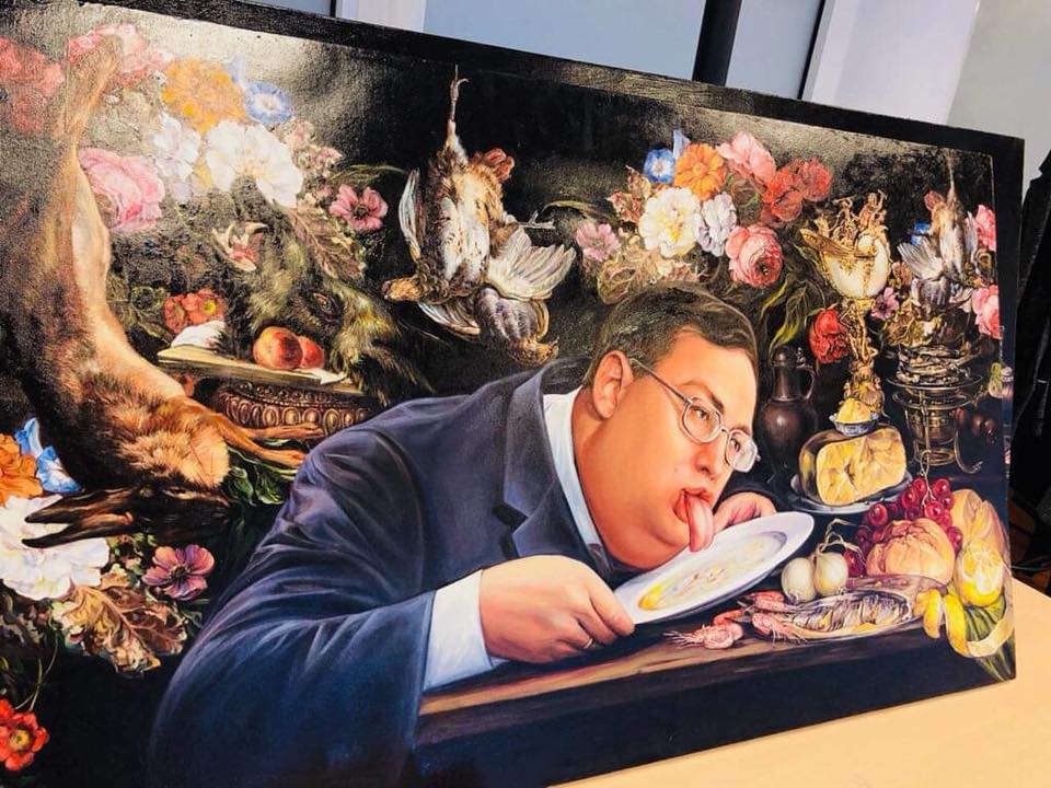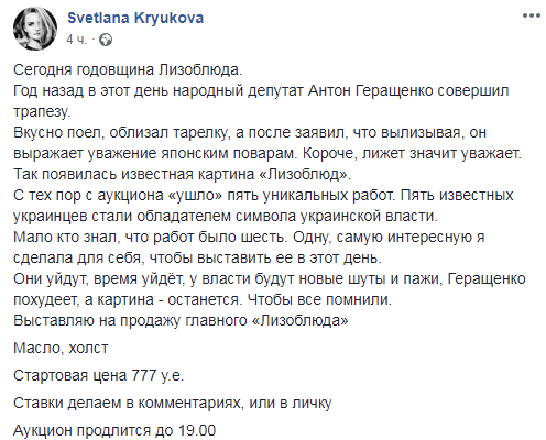 С тех пор с аукциона "ушло" пять уникальных работ. Пять известных украинцев стали обладателем символа украинской власти. Мало кто знал, что работ было шесть. Одну, самую интересную я сделала для себя, чтобы выставить ее в этот день. Они уйдут, время уйдёт, у власти будут новые шуты и пажи, Геращенко похудеет, а картина - останется. Чтобы все помнили. Выставляю на продажу главного "Лизоблюда", - отмечено в пояснении к аукциону.