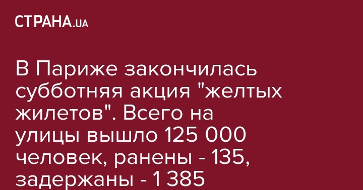 В Париже закончилась субботняя акция "желтых жилетов". Всего на улицы вышло 125 000 человек, ранены - 135, задержаны - 1 385