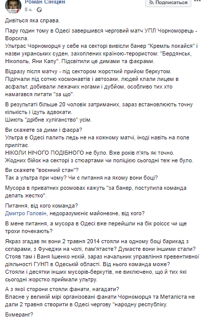 "Ультрас "Черноморца" у себя на секторе вывесили баннер "Кремль, покайся" и названия украинских судов, захваченных страной-террористом: "Бердянск", Никополь", "Яны Капу". Подсветили это дымами и файерами. Сразу после матча - под сектором жесткий прием беркутом... Вы скажете за дым и файера? Мусора в частных разговорах говорят "за баннер, поступила команда делать жестко", - написал он.