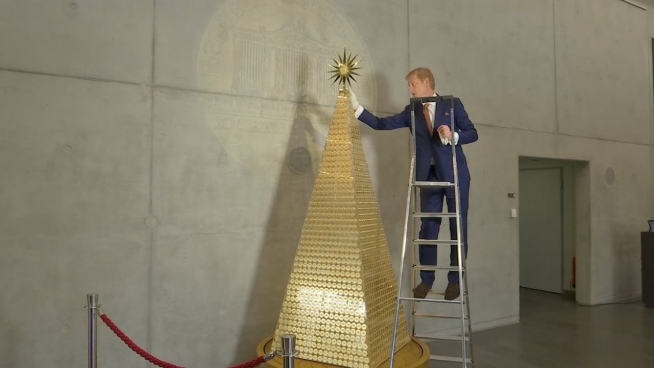 Елка стоимостью в 2,3 миллиона евро (2,6 миллиона долларов) украшает офис немецкой фирмы по торговле золотом Pro Aurum. Такой дорогой она получилась потому, что она полностью сделана из золотых монет.