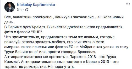 Антиправительственные протесты в Париже в 2018 - это "рука Кремля". Антиправительственные протесты в Киеве в 2013 - это торжество демократии. Не перепутать".