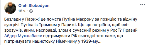 "Беспорядки в Париже это месть Путина Макрону за позицию и отмену встречи Путина с Трампом в Париже. Что еще нужно, чтобы мир знал, каким на самом деле злом является современный режим в России? Прав Айдер Муждабаев: поддерживать РФ сегодня то же самое, что поддерживать нацистскую Германию в 1939-м .."