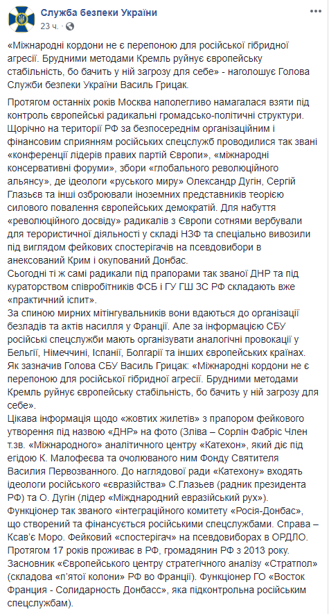 Отдельно СБУ выступила с заявлением-позицией, касающейся причастности Кремля и "русских хакеров" к французской революции.