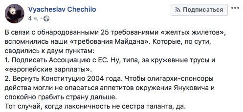 "В связи с обнародованными 25 требованиями "желтых жилетов", вспомнились наши "требования Майдана". Которые, по сути, сводились к двум пунктам: