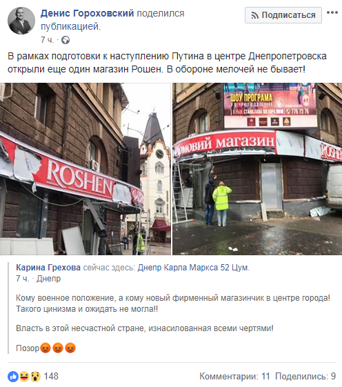 "В рамках подготовки к наступлению Путина в центре Днепропетровска открыли еще один магазин Рошен. В обороне мелочей не бывает", - написал он.