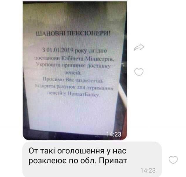 "Уважаемые пенсионеры! С 1 января 2019 года, в соответствии с постановлением Кабинета министров, "Укрпочта" прекращает доставку пенсий. Просим вас заблаговременно открыть счет для получения пенсий в ПриватБанке", - такие объявления расклеивались на улицах Черновцов.