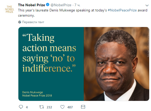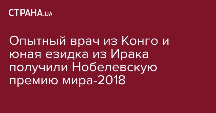 Отметим, что Нобелевскую премию мира-2018 присудили конголезскому врачу Денису Муквеге и правозащитнице из Израиля Наде Мурад. Их отметили за усилия по прекращению использования сексуального насилия в качестве оружия войны и вооруженных конфликтов.