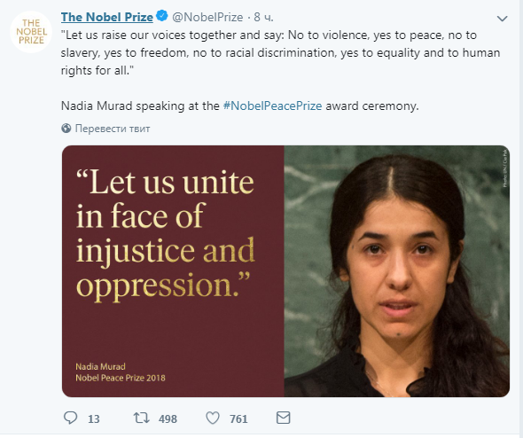 10 декабря в Норвегии состоялась церемония вручения Нобелевской премии мира 2018. Об этом сообщается на официальной странице премии в Twitter.