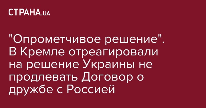 Так, Песков назвал решение не продлевать договор о дружбе с Российской федерацией опрометчивым решением украинского руководства. Также он выразил сожаление в связи с этим и предположил, что решение является проявлением неуважения к украинцам.