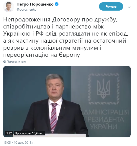 Закон, одобренный Верховной Радой, был подписан президентом Украины Петром Порошенко 10 декабря. Непродление договора с Россией следует рассматривать не как эпизод, а как часть стратегии Украины на окончательный разрыв "с колониальным прошлым" и переориентацию на Европу, заявил он на своей странице в Twitter.
