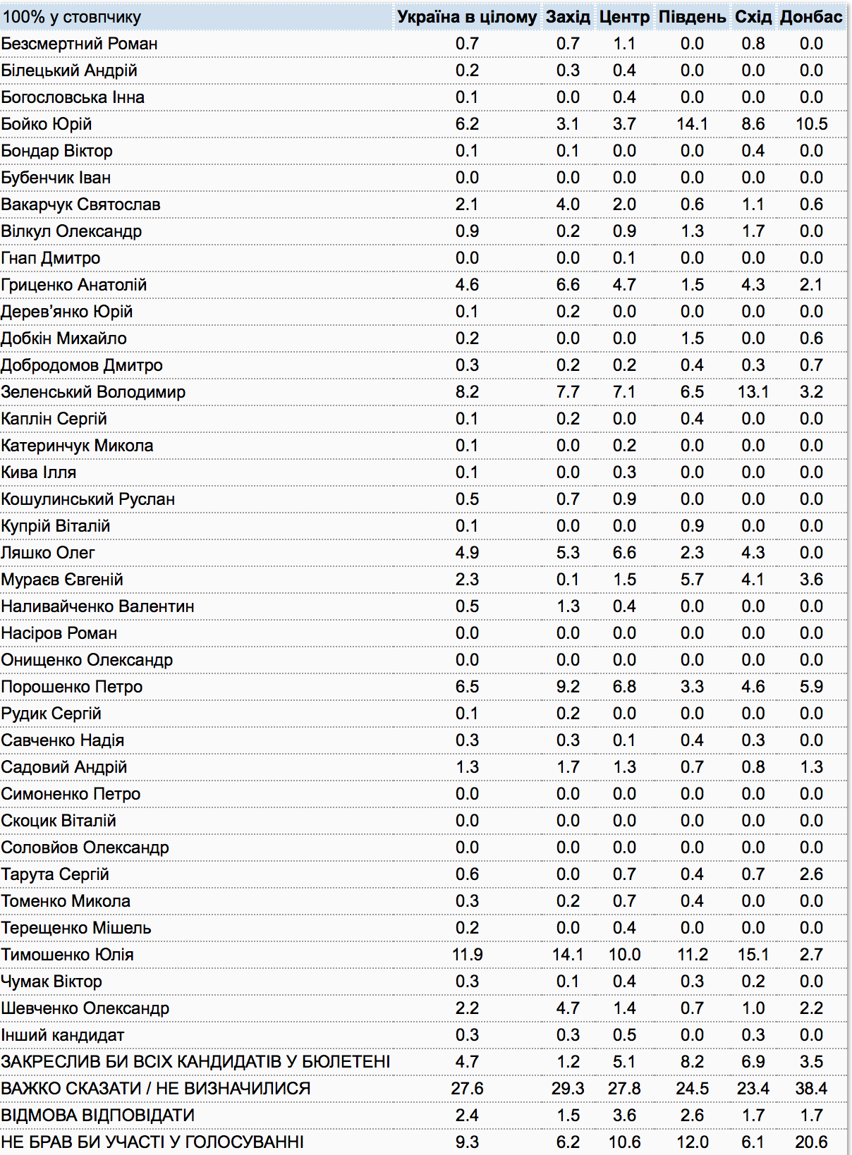 Во-первых, по-прежнему президент не попадает во второй тур. Причем его отставание от Зеленского увеличивается. Видимо, проблемы с повышением цены на газ и грядущим повышением тарифов на отопление и горячую воду волнует украинцев намного больше, чем Томос и проблематика военного положения.