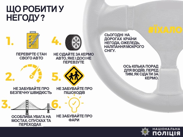 В Нацполиции дали несколько советов для тех, кто будет сегодня в дороге. Сначала водителям стоит проверить техническое состояние своего автомобиля и не садиться за руль, если машина еще не "переобута" в зимнюю резину. Также стоит придерживаться безопасной скорости, особенно на мостах, спусках и переходах. Также нужно не забывать о пешеходах и включать фары.