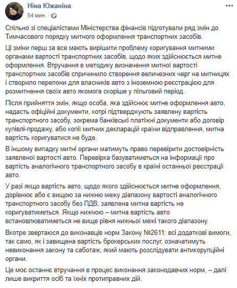 Как отметила глава парламентского комитета по вопросам налогообложения Нина Южанина на своей странице в Facebook, данные изменения были подготовлены Министерством финансов, чтобы решить вопрос с завышенной оценкой при растаможке. Теперь в случае, если владелец автомобиля сможет предоставить официальные документы, подтверждающие стоимость машины, то таможенная стоимость корректироваться не будет. Для этого подходят банковские платежки, договоры купли-продажи, а также таможенные декларации страны-отправителя. Если таких документов нет, то таможенники будут проверять достоверность заявленной стоимости автомобиля, отталкиваясь от стоимости аналогичного транспортного средства в стране последней регистрации авто.