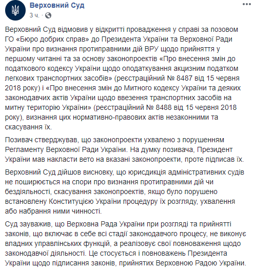 Верховный суд отказал в открытии производства по иску ОО "Бюро добрых дел" к президенту Петру Порошенко и Верховной Раде относительно законов о растаможке автомобилей на еврономерах. Об этом сообщает пресс-служба суда в Facebook.