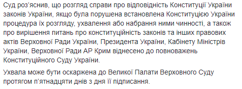 ВС отметил, что Верховная Рада при рассмотрении и принятии законов, включающих в себя все стадии законодательного процесса, не выполняет властных управленческих функций, а реализует свои полномочия по законодательной деятельности. Это касается и полномочий Президента относительно подписания законов, принятых парламентом.