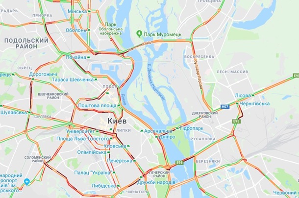 Также движение затруднено на на Северном и Южном мостах, а также на мосту Патона. Тянучки наблюдаются на улицах Жилянской, Льва Толстого и Набережно-Крещатицкой.