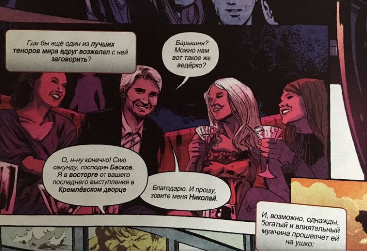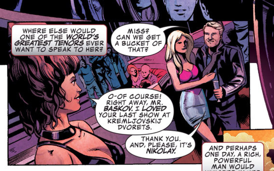 В частности, в статье говорится: "Николай Басков - оперный певец, считающийся одним из величайших теноров в мире. Николай Басков посетил один из самых горячих ночных клубов Москвы, флиртовал с женщинами и пригласил одну из хостесс выпить. Он не знал, что хостесс  на самом деле была агент Щ.И.Т.а Наташа Романова, которая выполняла секретную миссию по сближению с российским торговцем оружием Михаилом Федоровым".