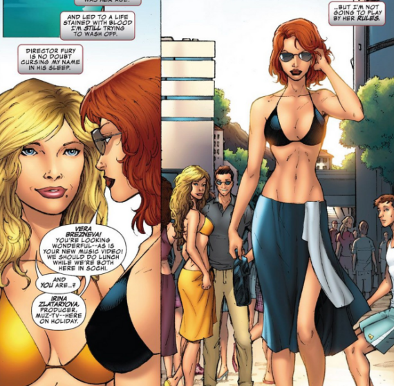 Как пишет Esquire, в этом же выпуске комикса появляется певица Вера Брежнева. Она отдыхает в Сочи после записи своего клипа, ей звонит Черная Вдова и, представившись продюсером музыкального канала, предлагает ей пообедать. Романофф это нужно, чтобы обеспечить себе алиби.
