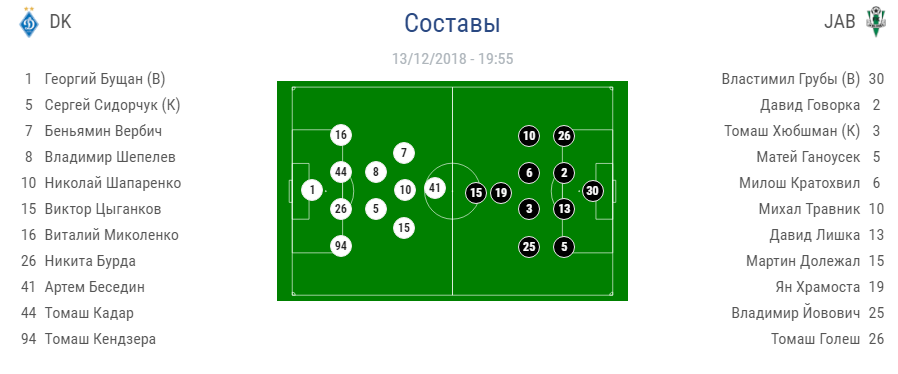 "Динамо": Бущан - защитники Кендзера, Бурда, Кадар, Миколенко - полузащитники Сидорчук, Шепелев - Цыганков, Шапаренко, Вербич - нападающий Беседин