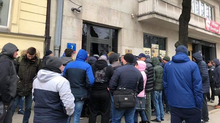 "На улице еще с ночи собирается пару сотен человек, еще записаны на бумаге до двух сотен. Принимают только с 8.30 до 12.00, поэтому успевают не все, приходят в следующие дни. Народ в очереди ругает власть  дебильные законы, из-за которых у них теперь сложности и надо стоять в очередях", - рассказал "Стране" живущий в Варшаве львовянин Сергей Демчук.