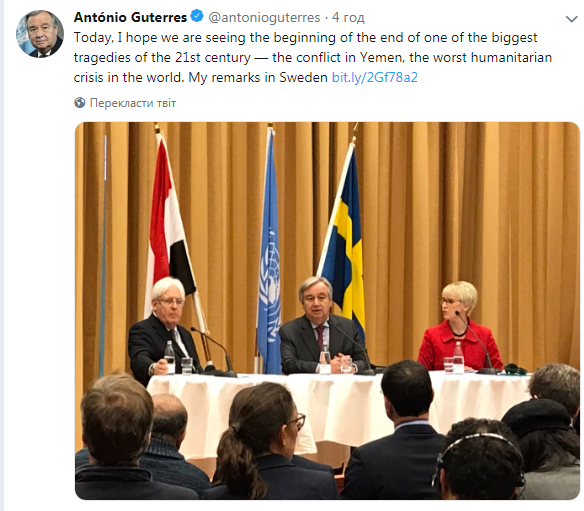 "Сегодня мы наблюдаем начало конца одной из самых больших трагедий XXI века - конфликта в Йемене, самого тяжелого гуманитарного кризиса в мире", - написал Гутерреш в своем Twitter.