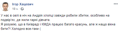 "У нас в селе в ночь на Андрея хлопцы всегда делали убытки, особенно во дворах, где жили красивые девушки. Я понимаю, что в Киевсовете и КГГА работает много красавиц, но зачем окна бить?! Холодно все-таки", - написал чиновник в соцсети и добавил фото с разбитым окном.