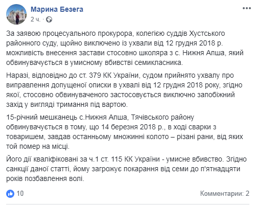 Хустский районный суд в Закарпатье исключил из решения о мере пресечения для подозреваемого в убийстве 14-летнего парня возможность внесения залога. Об этом сообщает пресс-секретарь Закарпатской облпрокуратуры Марина Безега на своей странице в Facebook.
