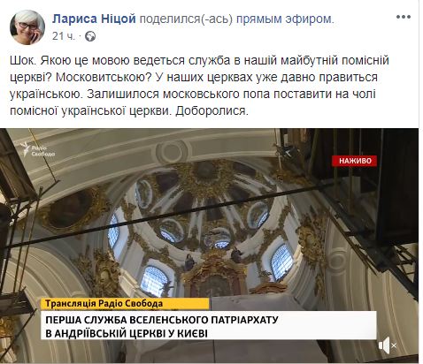 "Шок. На каком языке ведется служба в нашей будущей поместной церкви? Московитском? В наших церквях уже давно службы на украинском. Осталось московского попа поставить во главе поместной украинской церкви. Доборолись", - сказано в сообщении.