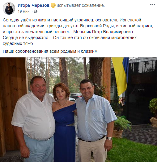 "Сегодня ушел из жизни настоящий украинец, основатель Ирпенской налоговой академии, трижды депутат Верховной Рады, истинный патриот, и просто замечательный человек - Мельник Петр Владимирович. Сердце не выдержало... Он так мечтал об окончании многолетних судебных тяжб... Наши соболезнования всем родным и близким", - сказано в сообщении.