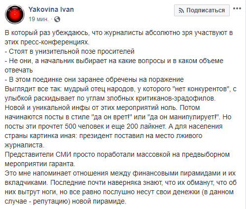 "В который раз убеждаюсь, что журналисты абсолютно зря участвуют в этих пресс-конференциях", пишет журналист Иван Яковына.