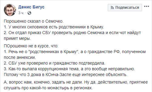2. Он отдал приказ СБУ проверить родню Семочка и если чот найдут примет меры", написал в Facebook журналист Денис Бигус.