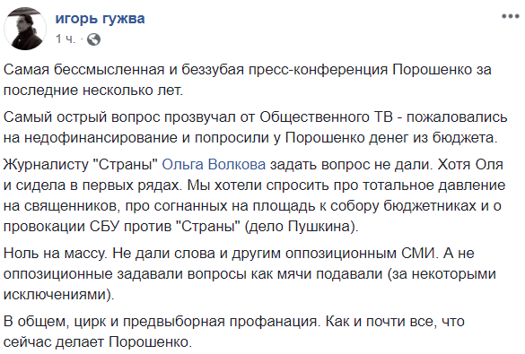 А для того чтобы посмотреть плохой спектакль в воскресенье журналисты будут направляться в театр, а не на пресс-конференцию главы государства", - отметил журналист Михаил Ткач, который опубликовал фото, как он просит слова на пресс-конференции.