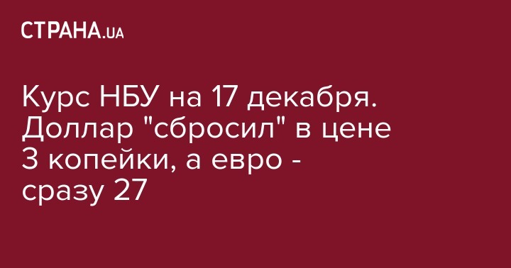 Национальный банк Украины (НБУ) установил на понедельник, 17 декабря, официальный курс основных валют по отношению к гривне. При этом регулятор понизил стоимость доллара до отметки 27,86 грн, таким образом американская валюта подешевела на три копейки по сравнению с курсом предыдущего банковского дня.