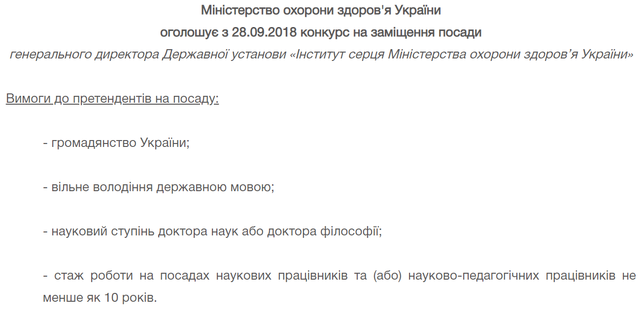 В конце сентября Минздрав объявил конкурс на замещение должности главы Института. Конкурс откровенно странный. Среди требований к соискателю, нет ни медицинской, ни "сердечной" специализации.
