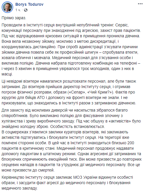 Однако в Минздраве снова поддержали националистов, а не врачей - и почти фразами С14 заговорила Ульяна Супрун. Она заявила в Facebook, что Борис Тодуров организовал специальный тренинг, где обучал сотрудников "симулировать потерю сознания", а другим приказал "спровоцировать конфликт", если в больницу придут радикалы.
