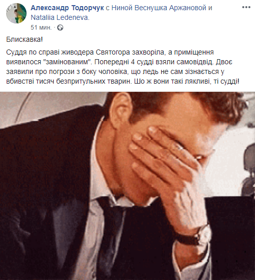 Выяснилось, что предыдущие 4 судьи, которые должны были рассматривать обвинения в адрес Святогора, отказались это делать. При этом, по данным активиста, двое из них заявили об угрозах со стороны живодера.