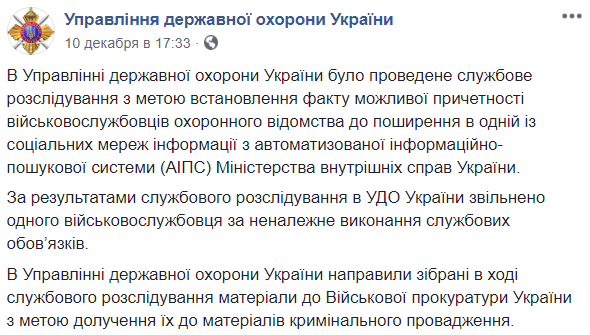 В службе Государственной охраны уволили сотрудника, который опубликовал в социальных сетях информацию закрытой информационной системы МВД. Об этом на днях сообщили в УГО на своей официальной странице в Facebook.