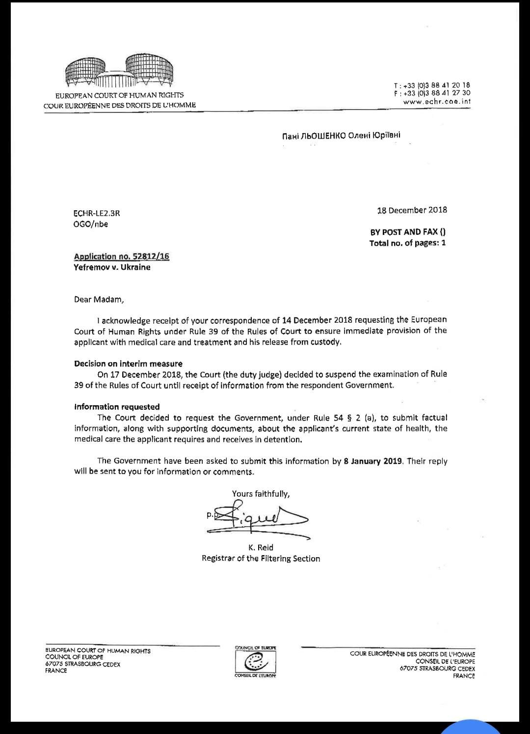 "ЕСПЧ сегодня отрегировал на мое обращение в рамках 39 Правила Регламента Суда о применении временных мер в связи с неоказанием надлежащей медицинской помощи и незаконного содержания под стражей Александра Ефремова. ЕСПЧ дал правительству Украины срок до 8 января предоставить всю информацию по делу Ефремова. Процесс пошел", - написала Лешенко.